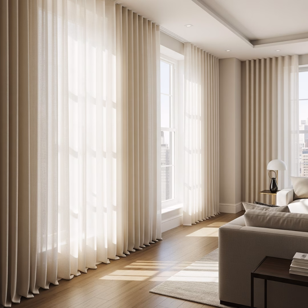 Ripple fold curtains create the clean, continuous wave you see in polished, design-forward interiors. Mounted on a discreet track system, the fabric glides smoothly and stacks neatly, giving your windows a modern, streamlined look from end to end. Toronto Window Treatments custom-measures and installs ripple fold drapery to perfectly follow your wall or window line, so every fold stays even and consistent.