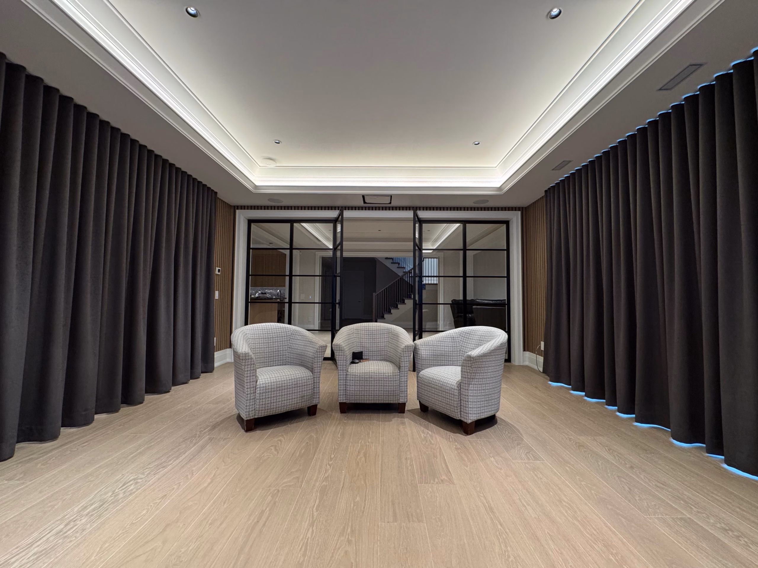 Soundproof drapes are designed to soften outside noise and make your home feel more peaceful, especially in busy urban spaces. Using dense, layered fabrics and full-length panels, Toronto Window Treatments custom-installs sound-dampening drapes that help reduce traffic noise, echoes, and everyday disruptions while adding a polished, designer look to your windows. For added convenience, they can also be motorized, so you can close off the world and quiet the room with a simple touch or smart home command.